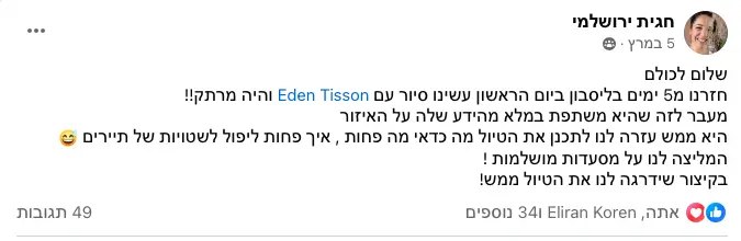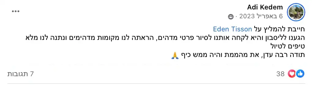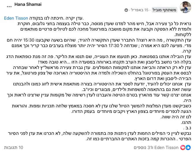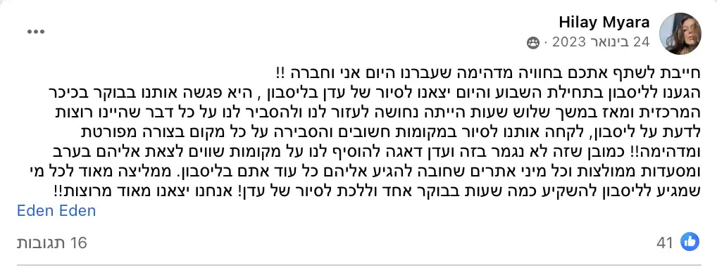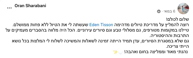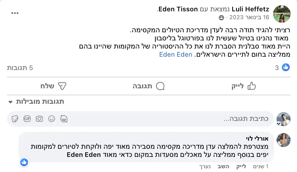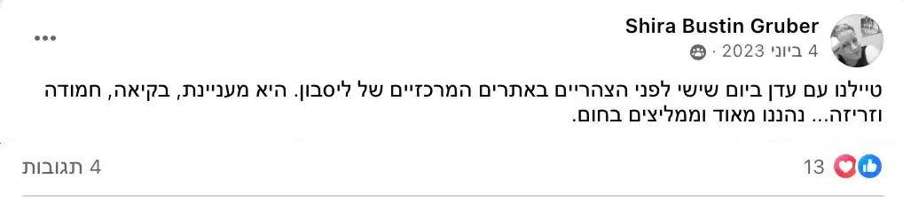 תשמעו, אני לא אוהבת להתרברב, אבל המשובים שאני מקבלת מדברים בעד עצמם. המטיילים שלי תמיד מספרים לי שהסיור היה הייטלייט של הטיול שלהם בפורטוגל. אני משקיעה את כל הלב בכל סיור, מתעדכנת כל הזמן במה שקורה בעיר, ומשתדלת לתת לכם חוויה שהיא הרבה מעבר לסיור רגיל. אבל אתם מוזמנים לבדוק בעצמכם - תצטרפו אליי לסיור ותראו למה כולם מדברים עליו!