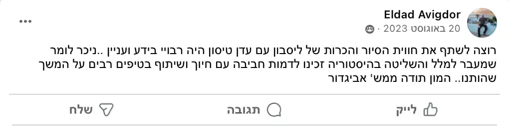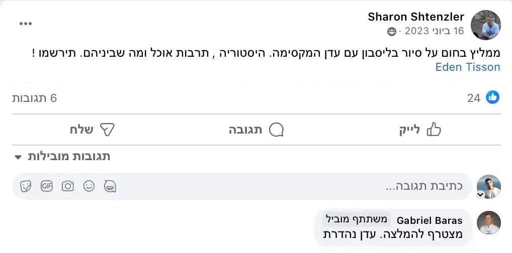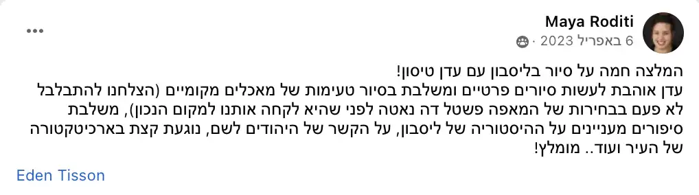 בטח! אני מציעה סיורים בעברית שמותאמים במיוחד למטיילים ישראלים. נסייר יחד ברחובות הציוריים של ליסבון, נטעם מהמטבח המקומי, ונחווה את הקסם של העיר בשפה שלנו. זו הזדמנות מעולה לגלות את ליסבון בצורה נוחה ומהנה, בלי מחסומי שפה.