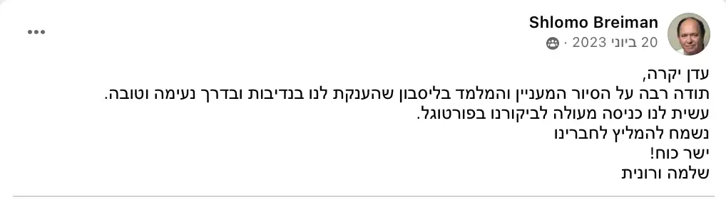 חוויה שהיא הרבה מעבר לסיור רגיל, ומספר המקומות בכל סיור מוגבל. זו ההזדמנות שלכם - לחוות את פורטוגל כפי שיודעי דבר זכו. צרו איתי קשר והבטיחו את מקומכם בהקדם!